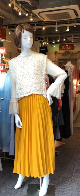 マスタードカラーのスカート💕 この秋もプリーツスカート旋風が吹いてます💕😍こんな綺麗なマスタードカラーなら着こなしを一新してくれますよ⭐️ 秋一番は綺麗なプリーツスカートをゲットしてくださいませーー 春に続き秋も大人気のレーストップスを合わせてみました。お色違いでブラックもございます😍 レースデザイントップス 6900円💕 2019年8月17日