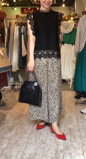 ドットのワイドパンツ 9800円💕 大人気のワイドパンツが再入荷致しました💕😃プリントは旬のドットです 落ち感のあるとろみ素材でスッキリとしたシルエットがGOODですー💕 大人気のレーストップスは、白がございますよん レーストップス 6860円💕 フラットシューズ 6860円💕 2019年8月18日