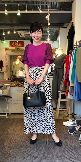 ベリーカラーのトップス 7900円💕 お袖がシフォンになった大変お洒落なニットが4カラーで到着しました💕😍 お写真のベリー、合わせやすいエクリュ、今年人気のブラウンと定番のブラックです👌🎉 これからの季節に大活躍しますよぉ〜 手提げバック 3900円💕チャーム付き ドットスカート 16000円💕 スエードパンプス 10000円💕 2019年8月18日