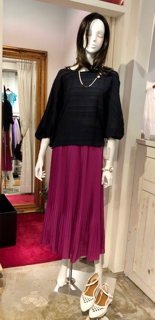 黒の七分袖ブラウス 11000円💕 よく見ると、ボーダー生地になったお洒落な生地のブラウスはいかがでしょう?💕 細かいプリーツがステキなパープルのスカートを合わせてコーディネートしてみました💕☘️ 今からすぐに着られる秋コーデでーす スカート 7700円💕 メッシュシューズ 9000円💕 2019年8月21日