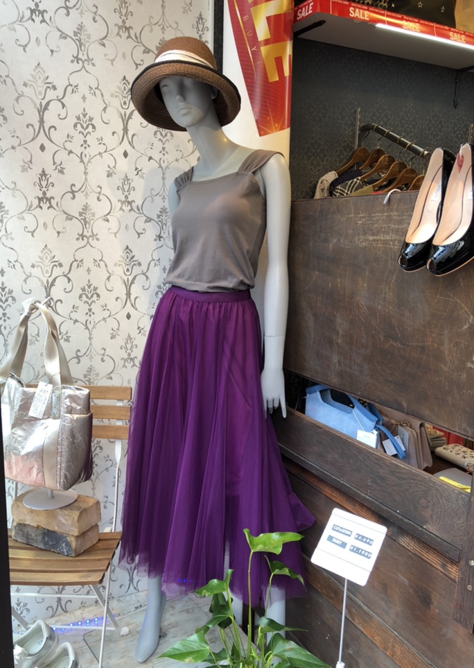 ベリーカラーのチュールスカート 💕 カーキのトップスとベリーカラーのチュールスカートのコーディネート💕はいかがでしょう? 肩幅の広いタンクトップは、綺麗なネックラインと着心地の良さが人気の秘密💕です お色違いはオフ白とブラックがございます💕 スカートは、ネイビー、チャコールグレー、カーキとお写真のパープルです☘️ 今からすぐに履ける秋の新作ですよん タンクトップ 4800円💕 チュールスカート 11000円💕 2019年8月8日