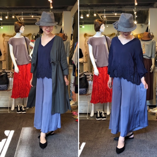 ネイビー❎ブルーのコーデ💕 この秋ネイビーは旬の着こなしにバッチリのカラーです💕 まだ暑いけどネイビーを入れたコーデにすると、キュッと引き締まったイメージになりますよぉ〜💕 是非トライしてみてください😃 ブラウス 6900円 パンツ 6900円 コート 17800円 ポニーシューズ 11000円 2019年9月3日