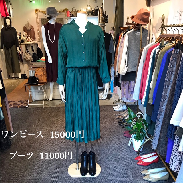 ワンピース 15000円💕 とろみ素材のワンピースはいかがでしょう?ウェストのゴムがソフトで締め付けが無く、快適な着心地です🎉😃 ウェスト周り腰回りが気になる方も、驚くほど綺麗に体型カバーしてくれる魔法のワンピース⭐️⭐️⭐️です。 グリーンとブラックがございます。 特価のブーツはもう直ぐ完売です😆 2019年10月6日