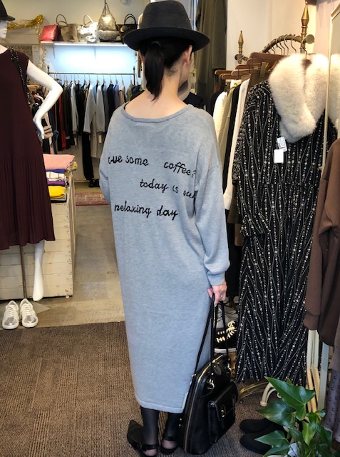 英字デザインニットワンピース 9800円💕 シンプルなニットワンピースのバックにインターシャ編み込みの英字デザインを入れました💕 一枚で素敵になれるスグレモノ💕💕💕 フロントは少し広めのVネックになります。お色違いは、モカブラウンとなっております🙌 2019年10月6日