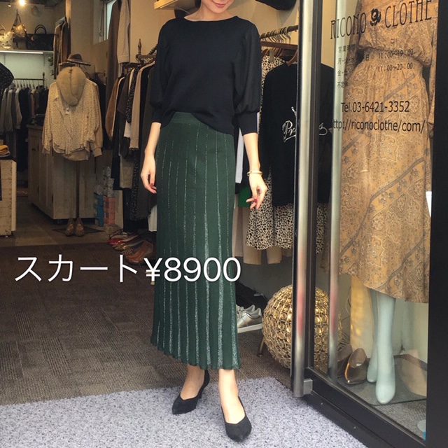 スカート 8900円💕 グリーンのニット素材に、ラメのストライプが入ったニットスカートです💓😊 ストライプが入ることによって縦のラインが強調され、スタイルアップにつながります✨ ぜひご試着にいらしてください😊💓 2019年10月11日