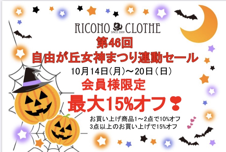 女神祭りSALE 本日スタートです💕 毎年大勢の人で賑わう女神祭りですが、今回は台風の影響で昨日からの賑わいになっております。 リコノクローシェも無事に昨日から営業しております💕 日程を遅らせて、大変お得なSALEをスタートいたしましたので、ぜひ自由が丘にお出かけくださいませ💕 2019年10月14日