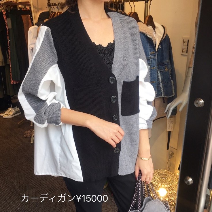 カーディガン15000円💕 モノトーンカラーがお洒落なデザインカーディガンです😊 ニットとシャツの異素材ミックスで、着るだけで素敵に見せてくれますよ😍 デニムとの相性もばっちりです❤️ 2019年10月15日