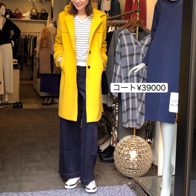 コート39000円💕 鮮やかイエローのコート😊💛 暗めの色を選びがちなアウターですが、綺麗なイエローはいかがでしょうか?😊✨ カラーコートは合わせるのが難しい…と思われがちですが、イエローは黒、白、茶、グレーなどととっても相性が良いので、ベーシックなお色のお洋服にぴったりですよ😍❤️ イエローの他に黒もご用意しておりますので、ぜひ一度ご試着にいらしてください😊💛 2019年10月21日