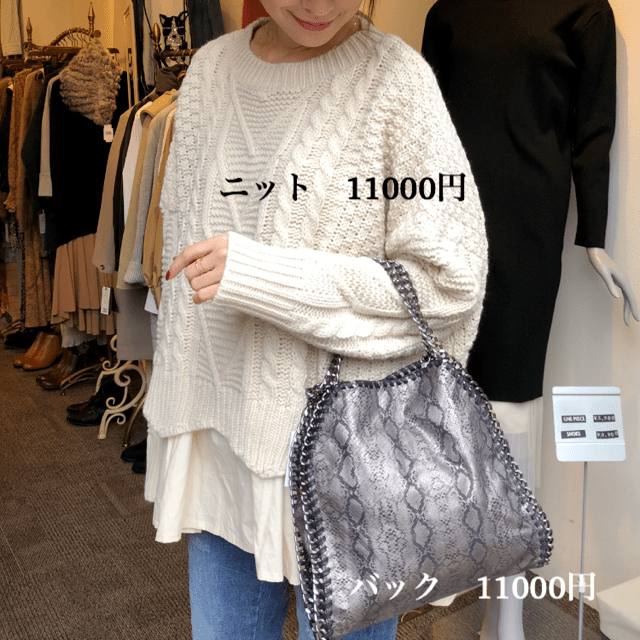 ケーブルデザインニット 11000円💕 こちらは、ケーブルニットと布帛がドッキングしたデザインニットです💕 ざっくりニットと布帛のレイヤードスタイルなので、着るだけでこなれた雰囲気💕 スキニーパンツやテーパードパンツは、もちろん、タイトスカートにもグッドです👍 腰回りを細く演出してくれるのも嬉しい💕 非ウールなので春先まで着られるアイボリーをセレクトしました💕 大人気のチェーンバックにパイソンが仲間入り💕 こちらも可愛い💕 2019年10月23日