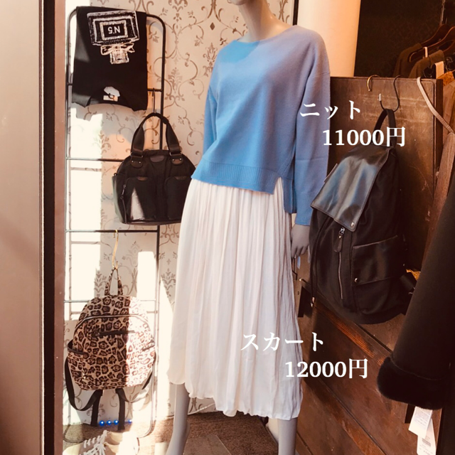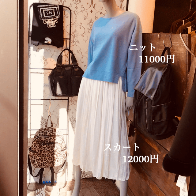 サックスブルー ❎アイボリー 綺麗なラメの入ったニットと白いスカートの爽やかなコーデはいかがでしょう?💕 ニットはアイボリー、ライトベージュ、ライトグレーもございます スカートのお色違いはネイビーがございます💕 他にもニットは20型以上入荷しております 2900円の特価ニットも大人気です💕😍 2019年11月7日