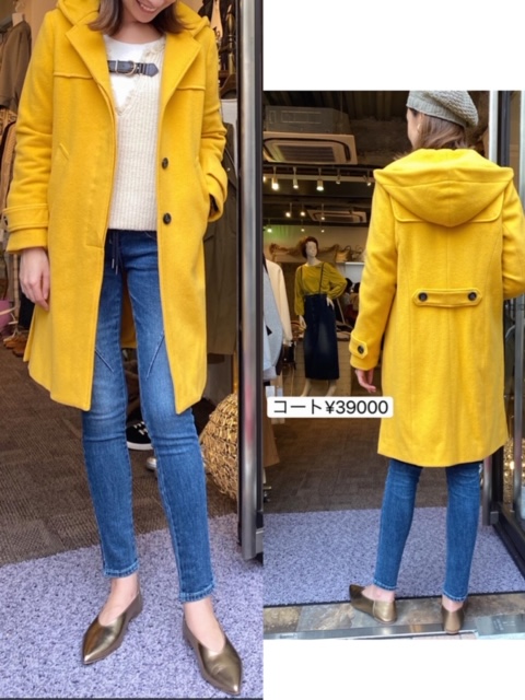 コート39000円💛 大人気💛鮮やかイエローのコート😊 暗めの色を選びがちなアウターですが、綺麗なイエローはいかがでしょうか😊✨ カラーコートは合わせるのが難しい…と思われがちですが、イエローは黒、白、茶、グレーなどととっても相性が良いので、ベーシックなお色のお洋服にぴったりですよ😍❤️ ぜひお試しにいらしてください💛 2019年11月11日