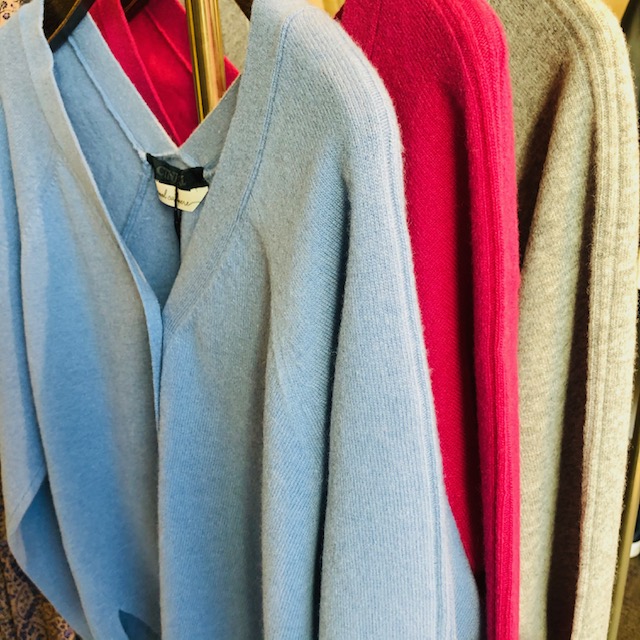 カシミア混ニットカーディガン 💕 綺麗なカラーと極上の着心地、ゆったりアームのお役立ちニットカーディガン が到着しました💕 デニムでも、ワンピースでも万能に着まわせますよぉ〜 コートのインナーにチラッと見えるカラーがお洒落なのです⭐️⭐️⭐️ サックスブルー 、ピンク、グレー、ブラックの4カラーです ニットカーディガン 12000円 2019年11月16日