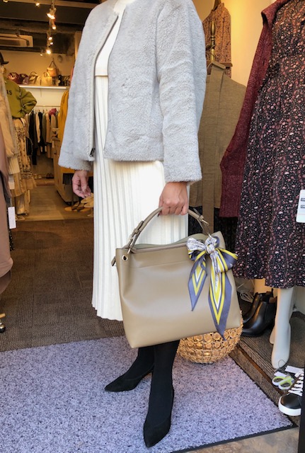 グレー❎アイボリーのコーデ💕 アイボリーのニットワンピースとライトグレーのフェイクムートンコート のコーディネートはいかがでしょう? ニットワンピは、体型を拾うから、、と敬遠していた方、こちらのワンピースなら肉感を拾わずスッキリと着こなせます💕💕💕 お写真のアイボリーの他に、モカベージュとブラックがございます ニットワンピース 10000円 スカーフ付きバック 5900円 コート 23000円 2019年11月17日
