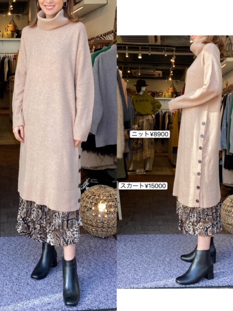 ニット8900円✨スカート15000円✨ ハイネックのロングニットワンピースと、おしゃれなパイソン柄スカート😊💕 ロングニットは、ボトムスにレギンスやスキニーパンツ、ワイドパンツも合わせられるので、とっても万能ですよ😍 パイソン柄のスカートは生地がとても柔らかいのでキツい印象にならず、コーデのポイントになるかと思います💕 ぜひご試着にいらしてください😊✨ 2019年11月21日