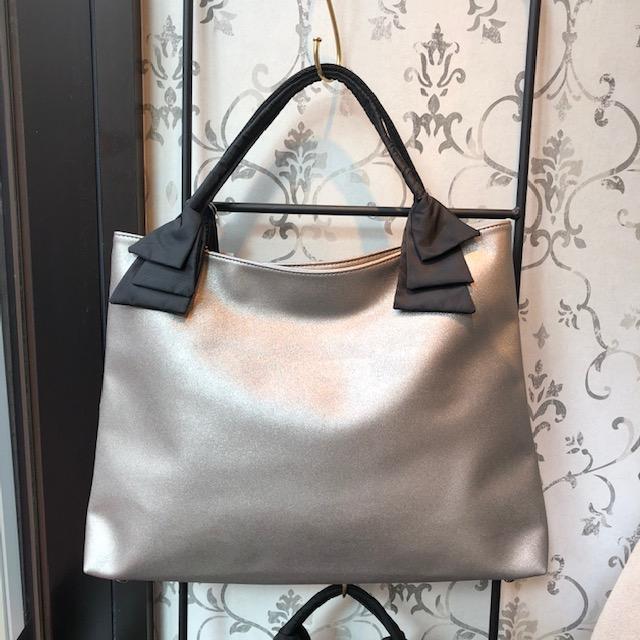 A4サイズの入るトートバッグ💕 大人気のリボンデザインのメタリック手提げバックが一個だけ入荷しました💕 いつも書類を持ち歩いたりするのだけど、フェミニンなタイプのバッグをお探しのお客様にぴったりのバックです💕 小ぶりなタイプもご用意しております。 手提げバック 5900円💕 2019年11月25日