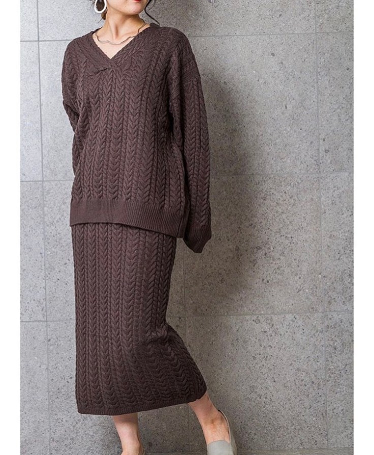ケーブルのセットアップ💕 スッキリしたVネックのニットをケーブル編みでデザインしたお洒落なニットとスカートのセットアップ💕 ダークブラウン、ベージュの2カラーで展開しております💕 明日から20%オフにてお買い求めいただけます😃🎉🎄 セットアップ 15000円→12000円 外税 2019年11月28日