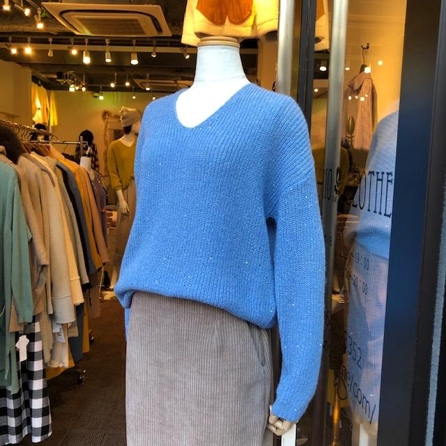 キラキラVネックニット💕50%オフ🎉😍 超特価のキラキラVネックニットが再入荷しました💕 今日のコーデは春らしいサックスブルーとカーキのタイトスカートにしました💕 スッキリVネックで着痩せ効果も😍 こちらは、白、ベージュ、グレー、ブラック、イエロー で展開しております ニット 7900円→3950円 2019年12月16日