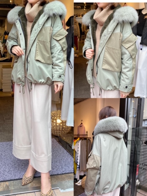 アウター28000円✨ 暖かくてお洒落なアウターが入荷しております⭐️ グリーンとカーキの配色と、フードのファーがポイントです😊 ファーにボリュームがあって、後ろ姿まで素敵ですよ😊❤️ アウター¥28000 2019年12月17日