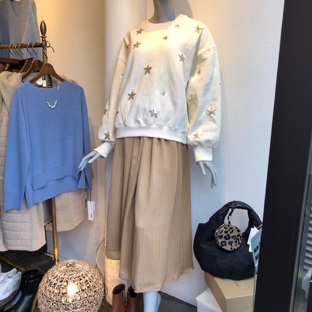 キラキラ星の裏毛トップス💕 100%コットン素材の裏毛トップスとシフォンスカートのコーデはいかがでしょう? 新春もスニーカー合わせで軽快な着こなしを楽しめます💕😃🎉 お色違いは、ブラックとカーキがございます。 各一点限りとなります🎄 大変お得なニットやコートが沢山入荷しておりますのでぜひ見にいらして下さい🌸 お正月に新しいコーデでお出かけして下さいませーーー 星のトップス 11000円→7700円💓 スカート 15000円💕 2019年12月25日