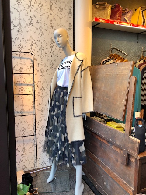 ニットカーディガン 8900円💕 軽くって暖かいニットカーディガンが再入荷しました💕 アイボリーにネイビーの配色が素敵です ダブルチュールのジオメトリック柄のスカートを合わせて、ワンランク上のスカートコーデをお楽しみくださいませーー🎉🥰 配色カーディガン 8900円 ジオメトリックスカート 13000円 英字Tシャツ 4900円 2020年1月12日