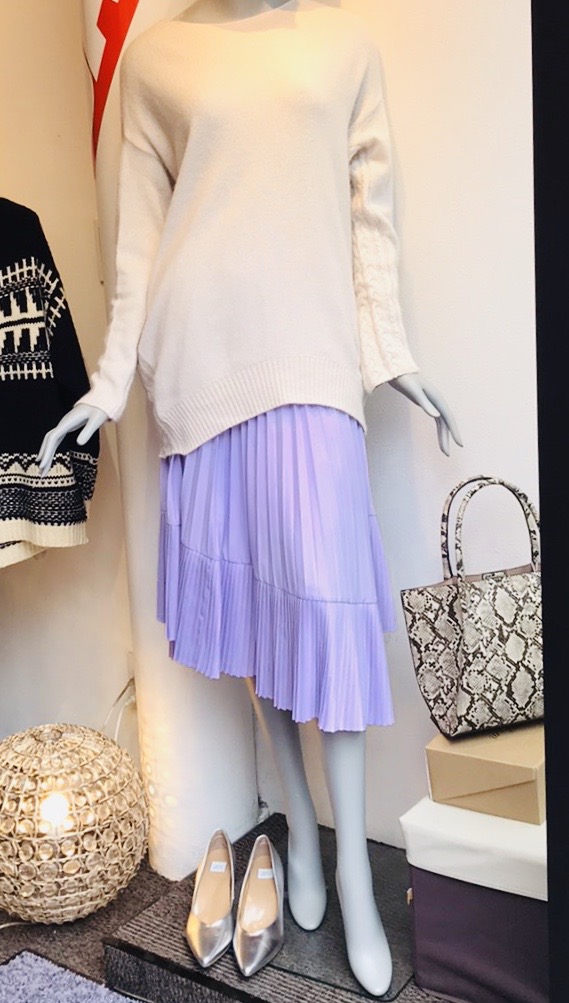 ラベンダー色のプリーツスカート 💕 春一番は歩くたびに揺れるランダムプリーツスカートはいかがでしょう?💕😃 お写真のラベンダーの他、レモンイエロー、ホワイト、グレージュ、サックスブルー 、ブラックの5カラーで入荷しました💕 フンワリと暖かいアイボリーのニットと合わせて、春を先取りコーデの完成です👍🥰 ニット 9800円→ SALE 6860円 スカート 16000円 2020年1月22日
