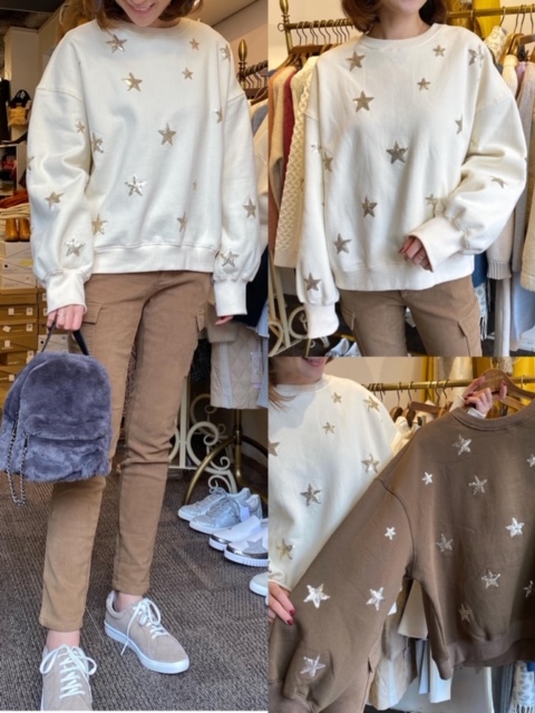 星スウェット7700円✨ 星柄がかわいい⭐️ スウェットのご紹介です✨ スパンコールで施された星柄が、大人カジュアルなコーデにぴったりです😍 今ならお買い得ですよー💕💕 星柄スウェット¥11000→¥7700 2020年1月23日
