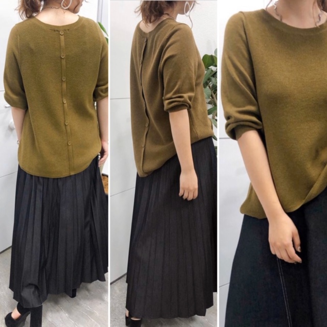 後ろボタンのデザインニット50%オフ 後ろのボタンと前のタックデザインで、着るだけでスタイリングが決まるお役立ちニットが何と50%オフになりましたーー 渋いカーキ色がクールで洗練された印象です ニット9800円→4900円 2020年1月25日