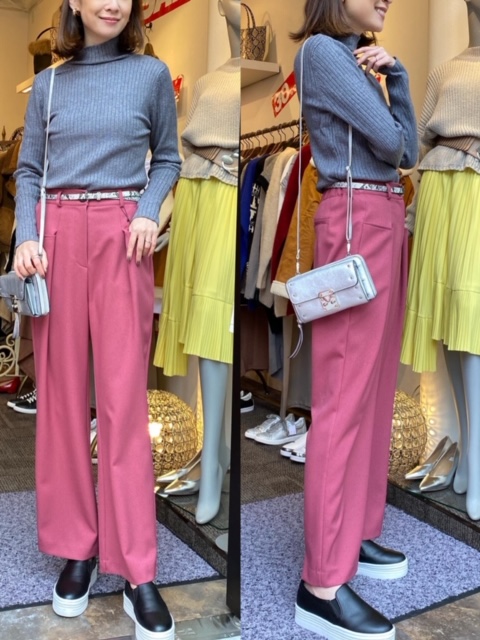 ニット5530円✨パンツ8800円✨ シンプルなタートルニットと、ピンクのタックパンツのご紹介です💕💕 定番のタートルネックニットはとーっても着まわししやすいですよ✨ 薄手なので、春まで着ていただけます😊 お洒落なピンク色のパンツは、タックが入っていてラインが綺麗です✨コーデにカラーものを取り入れる際は、ボトムスで色物を選ぶことをおすすめしますので、こちらはぴったりかと思います❣️ ぜひご試着くださいませ😊✨ タートルネックニット¥7900→¥5530 パンツ¥11000→¥8800 ウォレットバッグ¥4500 2020年1月29日