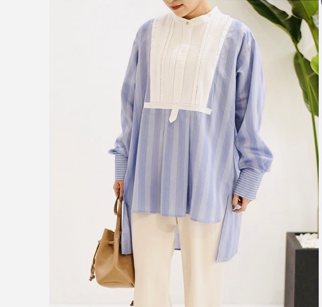 新作デザインブラウス💕 ストライプと切り替えの白のピンタックが端正な表情のチュニックブラウスが今週入荷します💕 春を感じる長袖のブラウスは、暖かいインナーやコートを羽織れば、すぐに着られるお役立ちのアイテムですよぉーーー お色違いはホワイト❎ホワイトがございます 2020年1月29日