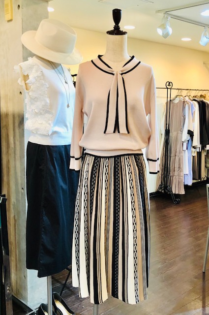 ベージュ❎ブラックコーデ お洒落な配色のボウタイニットとマルチストライプのニットスカートのコーデはいかがでしょうか? オフィスでも一目置かれる、きちんと感のあるコーディネート💕 限定数で、本日31日の午後に入荷いたします💕💕 お買い得アイテムを探しにぜひお立ち寄りくださいませーー💕💕💕 ニット 11000円 スカート 11000円 2020年1月31日
