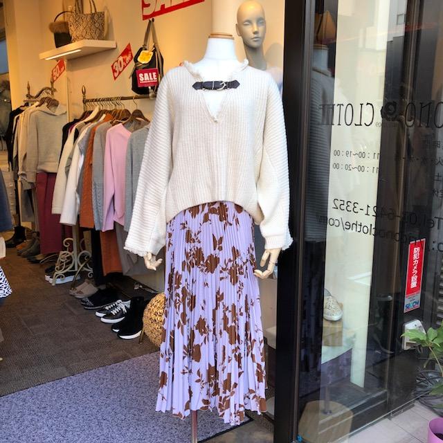 ベルトデザインニット💕 胸元のバックルがポイントのデザインニットはいかがでしょうか? 大きめのVネックなので、着痩せ効果抜群の一枚💕💕💕 スカートでもパンツでも上手にコーデが出来ます👍 花柄のプリーツパンツは再入荷となっております😊 ベルトデザインニット 8900円→6230円 プリーツパンツ 11800円💕 2020年1月30日