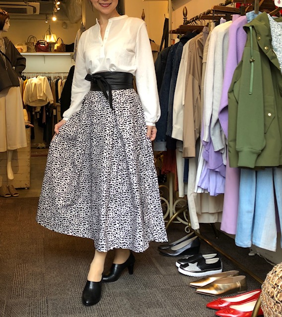 ブラウスは、ヘンリーネックの前ボタンで、前の掲載で着ている商品です。