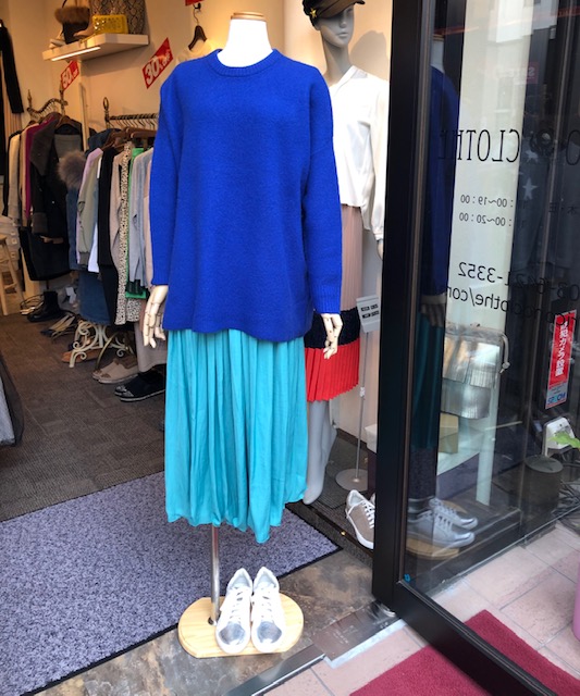 エメラルドグリーンのスカート💕 綺麗なエメラルドグリーンのスカートとロイヤルブルーのニットで組み合わせてみました💕 ちょっと斬新ですが、けっこう合います💕 この春は綺麗なブルーがあると、脱マンネリが叶いますよん😍 2020年2月2日