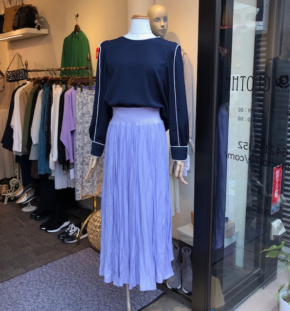 ラベンダー色のスカート 💕 クリンクル加工のロングスカート をネイビーのパイピングブラウスでコーディネートしてみました💕 シックなネイビーを選んでも、白のパイピングで華やかさをプラス💕 スカートはウェストゴム使用で、とーっても履き心地が良いです⭐️⭐️⭐️ ブラウス 5900円💕 スカート 12800円💕 2020年2月15日
