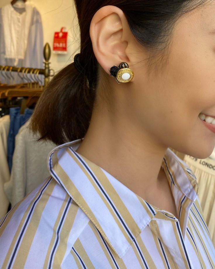 ヴィンテージボタンイヤリング¥4500✨ とーってもかわいいイヤリングやピアスが入荷しております😍 こちらはヴィンテージボタンのイヤリングですよ✨✨ 留め具はクリップタイプですので、耳も痛くなりにくく、付けるのも簡単です💕 ブラック×ゴールド×ホワイトの色合いがとってもお洒落ですね💕 他にも素敵なアクセサリーを多数ご用意しておりますので、ぜひご覧にいらしてください🤗✨ ヴィンテージボタンイヤリング¥4500 2020年2月24日