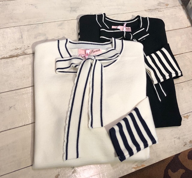 リボンニット 5900円💕 配色が素敵なボウタイニットはいかがでしょうか?💕 お袖と裾に入ったボーダーがアクセントになって、着るだけでメリハリをつけたコーディネートになります💕 黒と白の2色になります 配色ボウタイニット 5900円💕 2020年2月26日