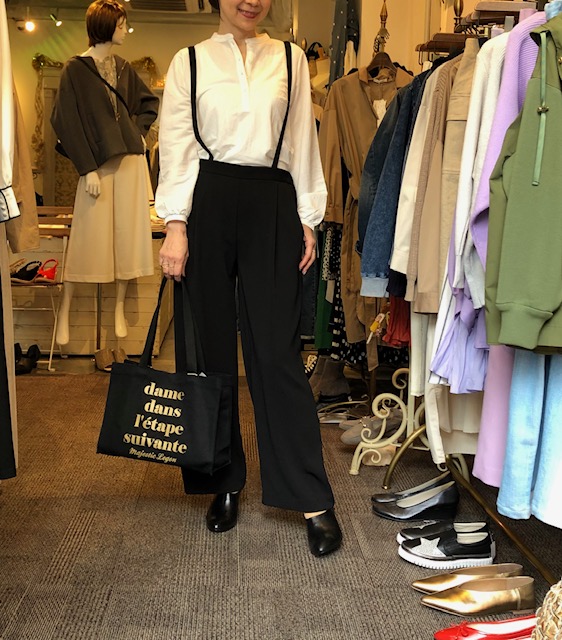 サスペンダー付きのワイドパンツ 💕 落ち感があってとっても履きやすい黒のワイドパンツと白ブラウスのコーデはいかがでしょう? ブラウスは、ニットベストが付いて、何と5900円という、プチプラアイテムです💕 バックは大きな英字が素敵なトートバッグ💕 で、いかがでしょう? パンツ 10800円💕 バック 2900円💕 シューズ 18500円💕 2020年2月29日