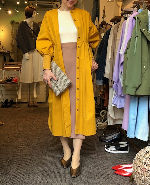 ノーカラーコート💕 17000円 タフタ素材のお洒落なノーカラーコートが再入荷いたしました💕 前を留めて、ワンピースとしてもお使いいただけます👍 春先はまだまだ、これからも寒いからコートやブルゾンをぜひ一枚ご用意くださいませねーー お色違いはベージュです💕 コート 17000円💕 2020年2月28日