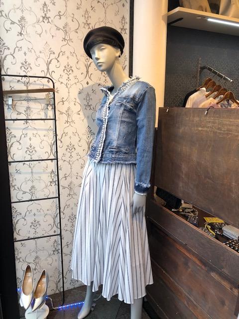 ストライプスカートとデニムジャケット💕 爽やかな白地にネイビーのストライプコットンスカートと🇮🇹イタリアデニムジャケットのコーディネートはいかがでしょう?💕 着痩せ&小顔効果をゲットできます⭐️ とびっきり爽やかなイメージで街を駆け抜けてくださいませーーー💕😃🙌 デニムジャケット 13800円 スカート 6900円 帽子 3900円 2020年3月2日