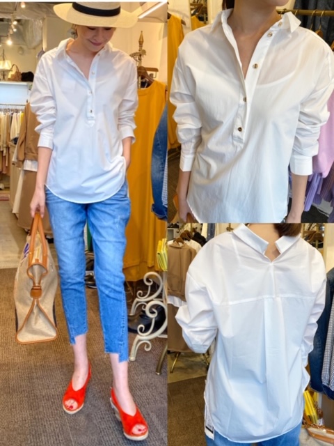 スキッパーシャツ¥5900✨ デニム¥13000 ✨サンダル¥9500✨ 金ボタンがポイントのお洒落なスキッパーシャツとデニムが入荷しております🤗 ブラウスはバックスタイルも素敵ですよ✨ホワイトの他にベージュもございます❣️ デニムは裾のデザインがポイントです😊 スキッパーシャツ¥5900 デニム¥13000 サンダル¥9500 2020年3月4日