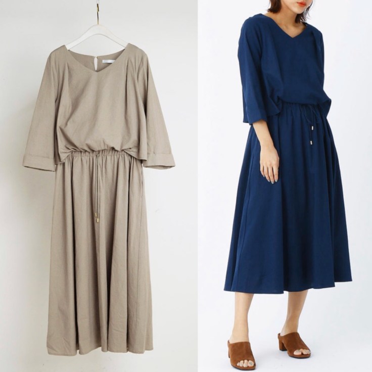 ウェストシャーリングワンピース💕 綿、麻、レーヨンのしなやかな素材感のワンピースが、特別価格の5900円💕 爽やかなベージュとクールなネイビーの2カラーで入荷しております🌸 一枚でサラッとサマになるワンピースですよぉーーーー 2020年3月6日