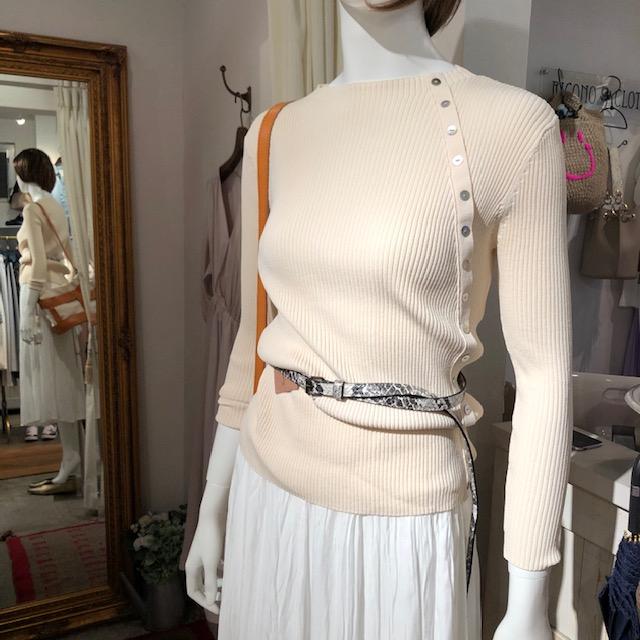 ボタンデザインニット💕 6900円 縦に並んだボタンがお洒落で、スッキリとしたシルエットが人気の春ニットが到着しました💕 こちらのアイボリーとペールグリーンの2カラーで展開しております💕 いつもブログを見てくださっているお客様に、今週末10%オフにて販売させて頂きます💕 こんな時ですので、ご配送も承りますので、お気軽にお申し付けくださいね😃🙌 本革ベルト 3900円 スカート 12800円 2020年3月14日