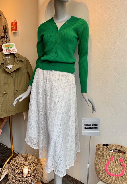 グリーンのニット❎白レースのスカート ビビッドなニットカーディガン と白のレーススカートのコーデはいかがでしょうか? こちらのスカートは比較的大きめなので、M〜Lサイズの方におすすめの一枚です💕 透け防止の裏地がついているので、白のスカートでも安心です⭐️ 2020年3月14日
