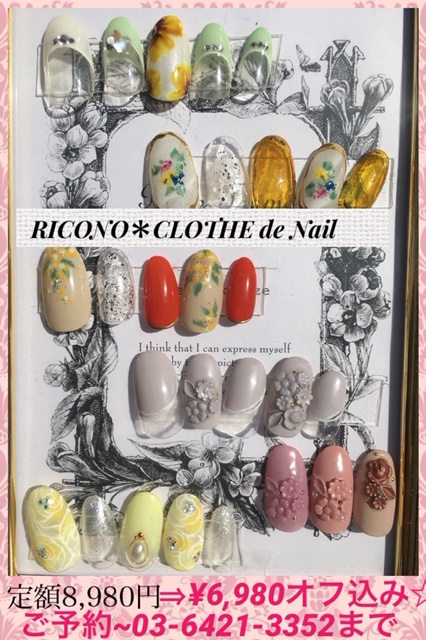 リコノクローシェ 春ネイル💕 とっても素敵なアートネイルがお得に楽しめるリコノネイルサービスはいかがでしょうか? お店の小部屋でソファで寛ぎながら、ゆったりと施術をしていただけます💕 ぜひご予約ください フットネイルも出来ます💕 コメントは受け付けていません。