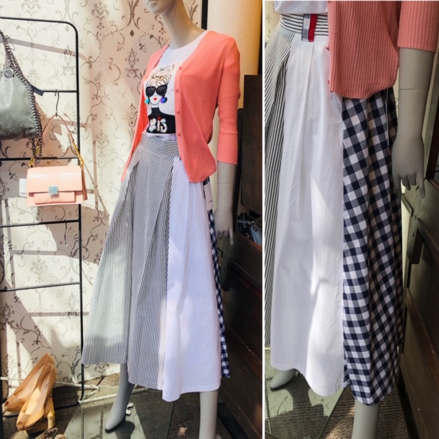 ストライプ❎チェックの切り替えスカート😍 とっても素敵な切り替えのロングスカート が到着しております💕 爽やかな白のストライプと、ネイビー系のチェックが堪らなく可愛い😍 ご配送も承りますので、お気軽に店頭までお申し付けください💕 スカート 12800円💕 Tシャツ 4900円💕 カーディガン 14000円💕 2020年3月27日