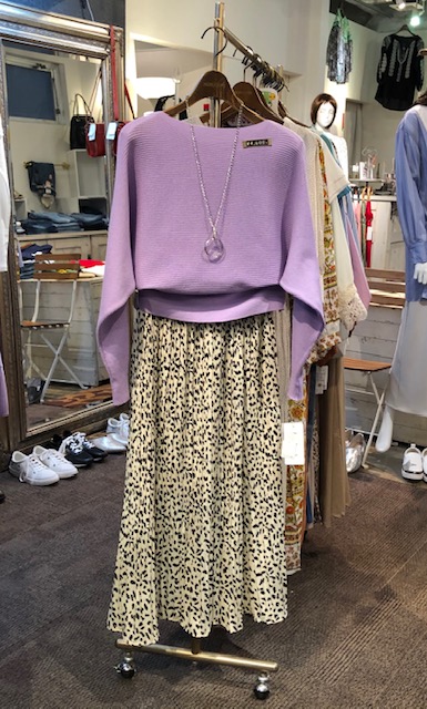 ラベンダーカラーのニット💕4900円🥰 サラッとした質感の春ニットはシルバーカラーのネックレス付き💕 スッキリとしたボートネックで着痩せ効果も😍 レオパード柄のプリーツスカートを合わせてフェミニンなスタイリングにしてみました💕 明日明後日は、外出自粛要請となっておりますので、送料無料にて全商品をご配送させて頂きます💕 お気軽に店頭までご連絡ください。 リコノクローシェ 03-6421-3352 ニット 4900円💕 スカート 8900円💕 2020年3月27日