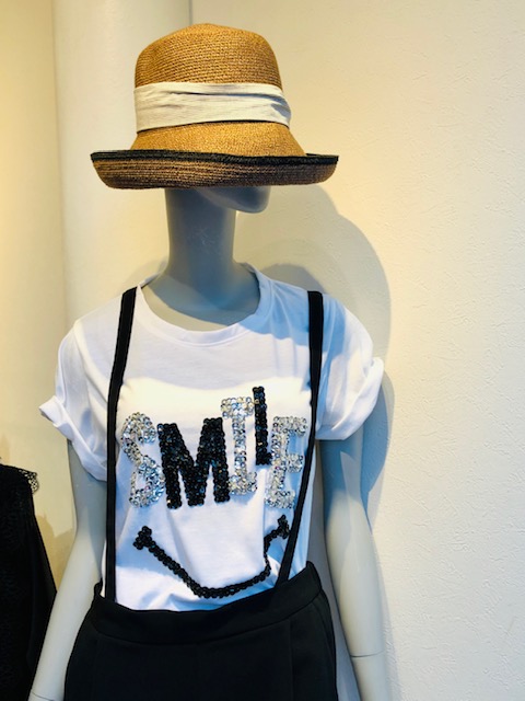 Smile ビジューTシャツ 6400円💕 胸元にお洒落なビジューのモチーフが入荷しました💕 ビジューは縫い付けてあるので、お家で手洗いして頂けます😃🙌 可愛いTシャツはお早めにチェックしてくださいませね 2020年3月28日