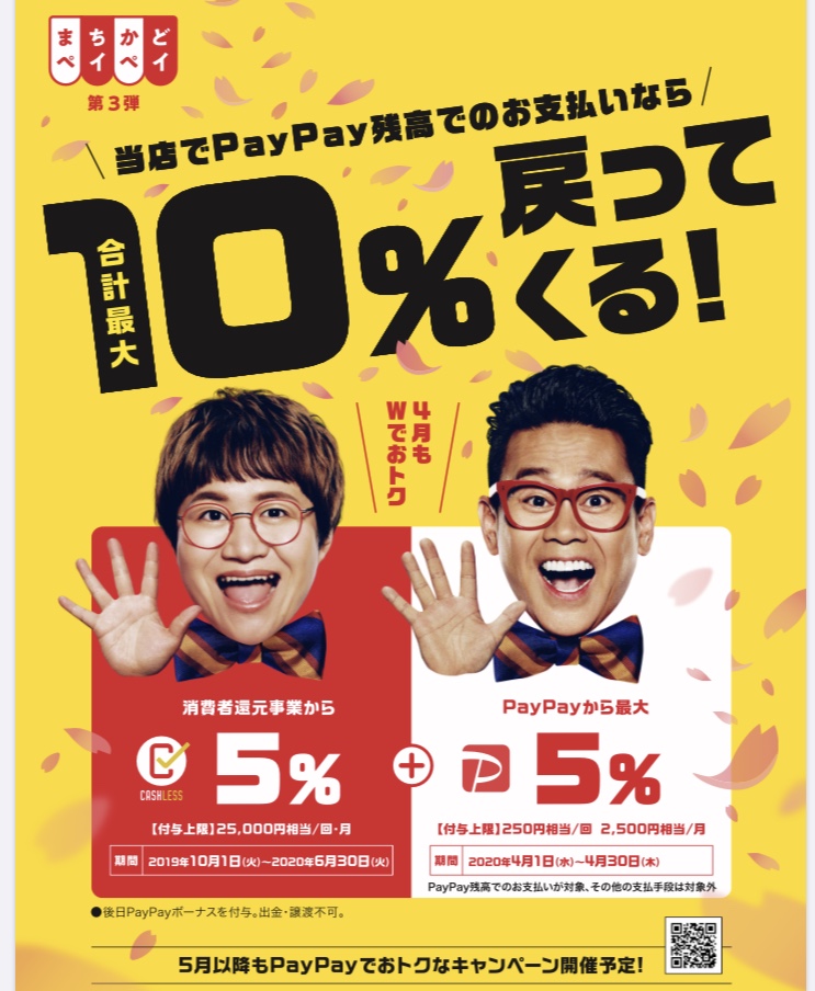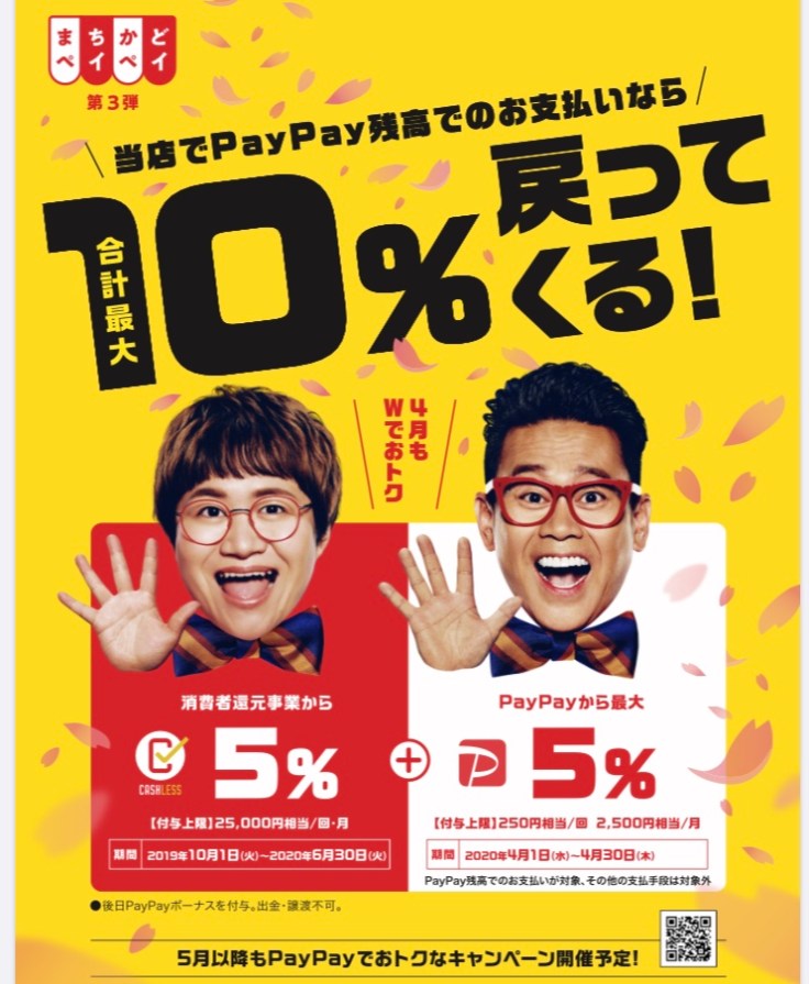 PayPayで最大10%のキャッシュバック💕 本日よりまちかどPayPayキャンペーンがスタートしました💕 リコノクローシェでのお買い物をPayPayでお支払いになると、通常は5%のキャッシュバックが、4月1日から4月30日までは特別キャンペーンにより、最大10%💕がキャッシュバックされます😍 こんな時ではございますが、新しいアイテムを買ったりして気分を変えたい方、ぜひお待ちしております💕💕💕 使い方がわからない方も店頭にてご説明させて頂きますので、お気軽にお声掛け下さいね😃🙌 2020年4月1日