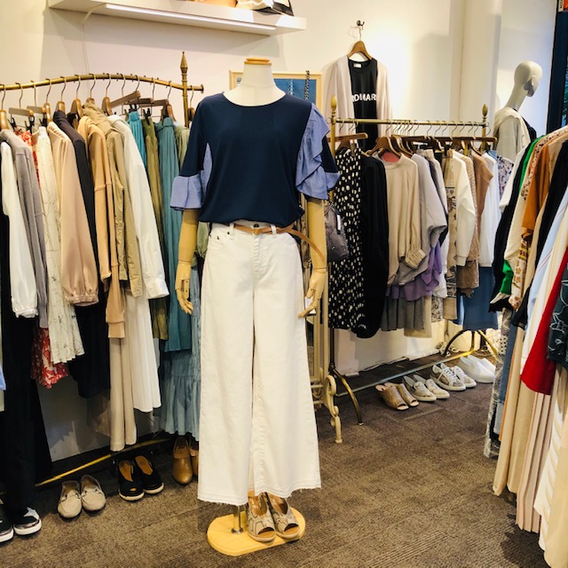 デザイントップス💕7500円💕 アシンメトリーにラッフルフリルを付けたお洒落なカットソーが到着しました💕 ソフトなコットン素材で着心地も◎🥰 お色違いでホワイト❎カーキ、ブラック❎グレー、もございます💕 カットソー 7500円 本革ベルト 3900円 ワイドパンツ 12800円 2020年4月3日