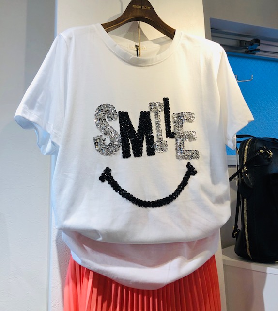 スマイルTシャツ 6400円💕 ニコちゃんのスマイルの英字がお洒落なビジューTシャツはいかがでしょう?💕 着るだけで、周りのみんなもスマイル💕になりそうな、パワーアップのTシャツですよん⤴️⤴️⤴️ お色違いはブラックがございます💕 2020年4月9日